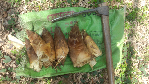 これは掘り出したタケノコです。一緒に写っているツルハシのようなのは、タケノコを掘る専用のクワです。 |