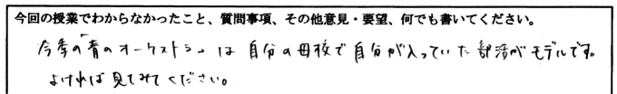 高校の部活ではブラスバンドは良く聞きますが、弦楽器も含んだオーケストラは珍しいですね(それとも私が知らないだけで、けっこうあるのかな)。