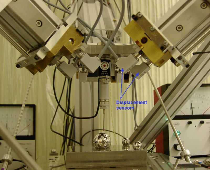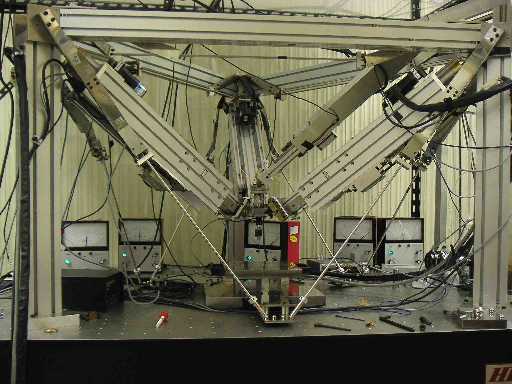 This is a photo around the the moving platform with a touch trigger probe and some displacement censers. You can see some displacement sensors for measuring the joint runouts.(Click the photo for larger one)