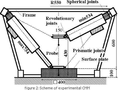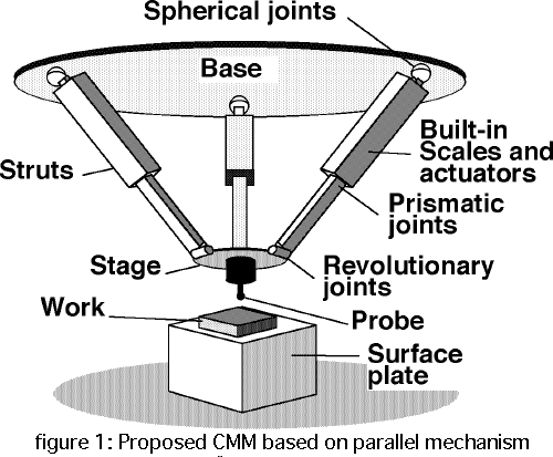 Figure 1 depicts the proposed CMM. The touch trigger probe attached to the stage is connected to three struts through the revolutionary joints. Each strut is connected to the overhead base through three spherical joints and contains within it a prismatic joint, the length measuring instruments (scales) and actuators to expand and contract itself. Variations in the length of the three struts move the stage in three-dimensional space. When the probe touches the measuring object, the probe's position (coordinate) and attitude can be derived absolutely from the strut lengths. The proposed CMM has a number of advantages over the conventional CMM; (1) because the probe is in sensitive directions of the scales, the motion error of the stage has little effect on the measured value; (2) the truss structure has a high stiffness because its members are subject to very few bending forces; (3) the systematic error produced by each of the scales is averaged with the other two; (4) the small inertial mass enables high moving speed.
