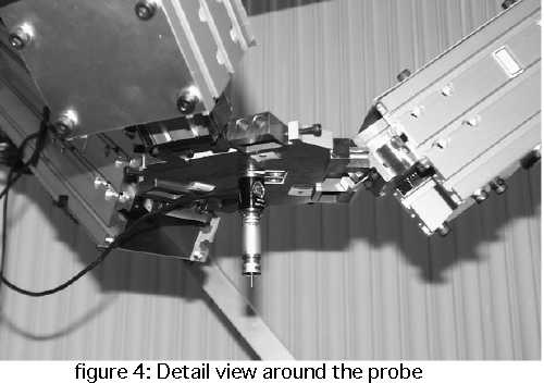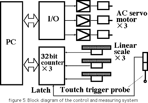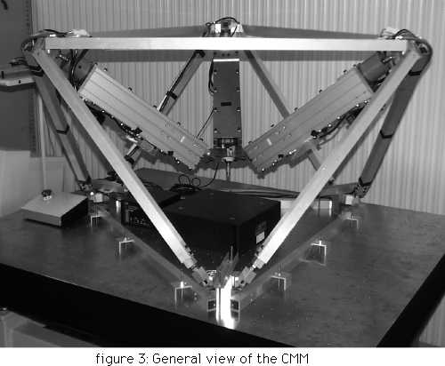 The experimental CMM with 3 DOF has been constructed as shown in figure 2 and figure 3. An octahedral truss frame and a granite surface plate are mounted on a vibration-isolation table. The frame supports three spherical joints connected three struts. The struts with the prismatic joints are expanded and contracted by three individual AC servomotors and ball screws. The prismatic joint is guided by four linear ball bearings. Each length variation of the struts is measured by three linear encoders with a nominal accuracy of 0.47 micromenter(p-p) and a resolution of 50nm (Sony, Laser Scale). Figure 4 shows the detail view around the stage. The stage mounting the touch trigger probe (Renishaw TP200, Repeatability: 2s=0.18 micrometer) is connected to the strut ends through three rotational joints. A stroke of the struts is 220mm, then measurement work space is 150X150X150mm approximately. Figure 5 shows the block diagram of the control and measuring system.