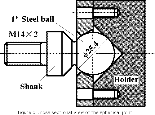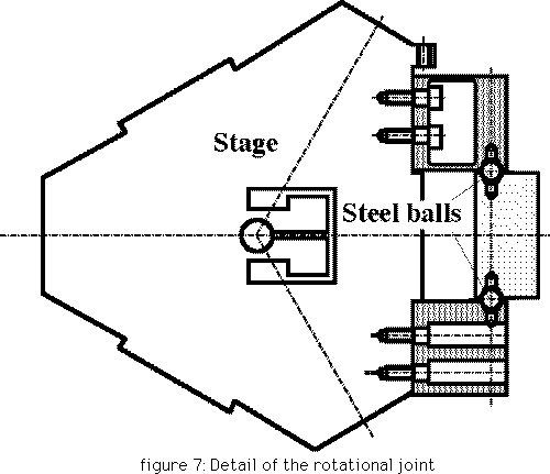 Figure 7 shows the detail of the rotational joint connecting the strut and the stage. The rotational joint employs the ball center system using 1/4" steel balls for ball bearings (nominal sphericity: 0.5 micrometer). It is estimated from previous work[4] that runout is less than 0.25 micrometer, and contact stiffness of the ball center system is more than 100 N/micrometer.