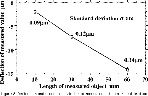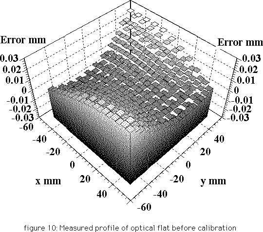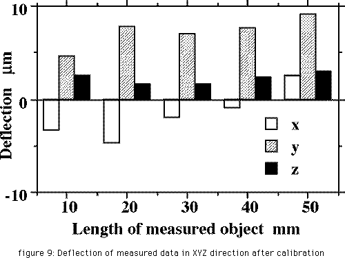 Figure 8 shows deflections and standard deviations of measured values before the calibration when measuring the length of the block gauges with several sizes in Z direction. The deflections increase in proportion to the gauge sizes because of measurement space distortion caused by the disagreement before calibration. The standard deviations, however, are less than 0.15 micrometer. This results show that this CMM has high repeatability of the mechanism. Figure 9 shows deflections measured in XYZ directions after calibration. The deflections are independent of the gauge block size, and are less than 10 micrometer. Figure 10 and figure 11 show measurement results of an optical flat with flatness of quarter wavelength (Measured area: 100mmX100mm). Measured profile before calibration is saddle-shaped surface with maximum deflection of 60 micrometer. After calibration, deflection of the measured surface decreases to 5 micrometer. I expect that measurement error will be decreased by more exact calibration because the measured surface is simple and continuous.